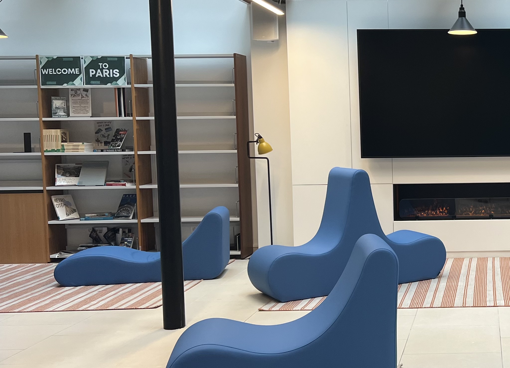 Lastly, an electric fireplace sits beneath the TV. While in theory it adds warmth, it clashes with the sterile and ultra-modernized look and feels out of place. But then again, no one would know since it is never actually on during the school day.